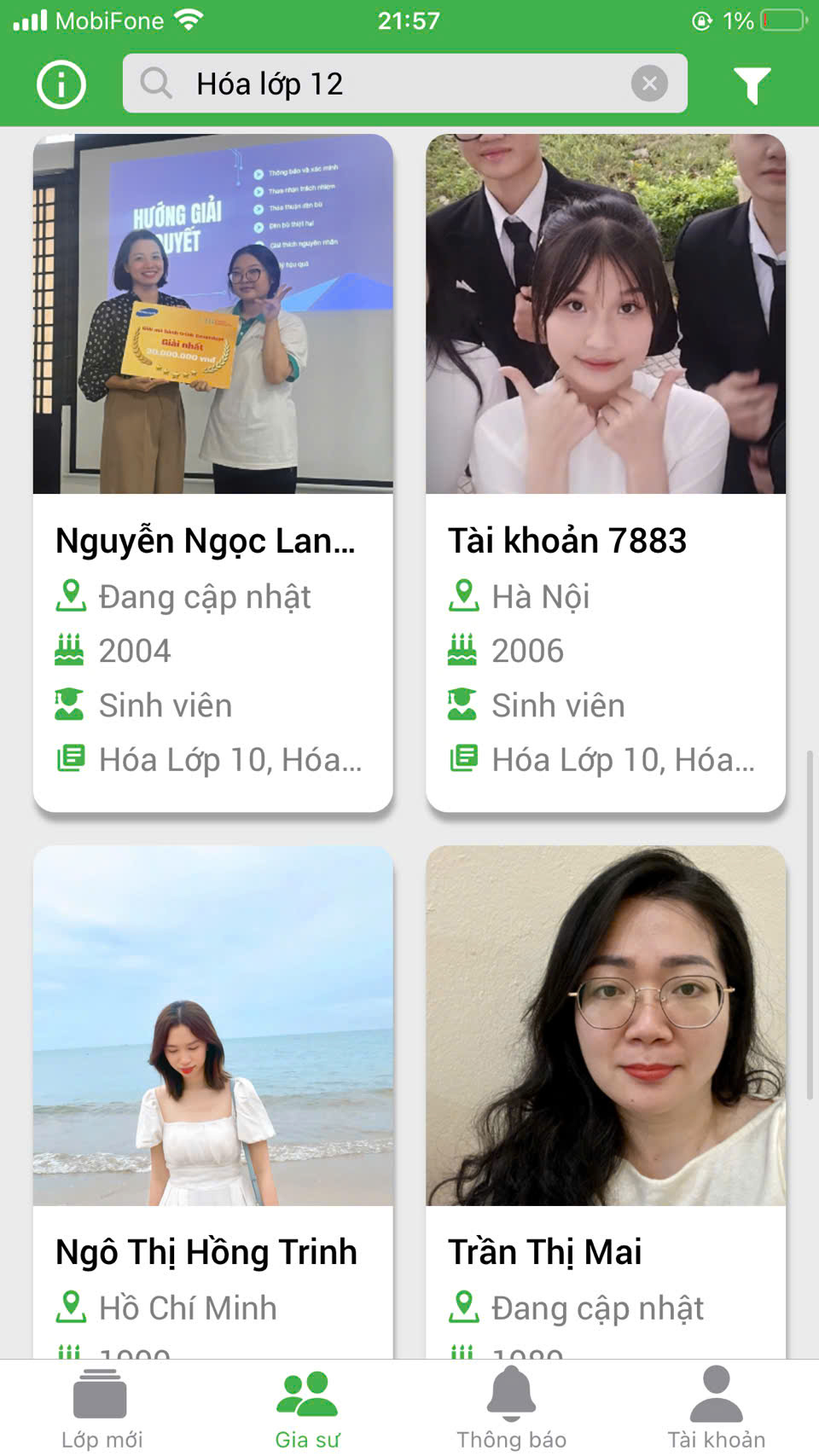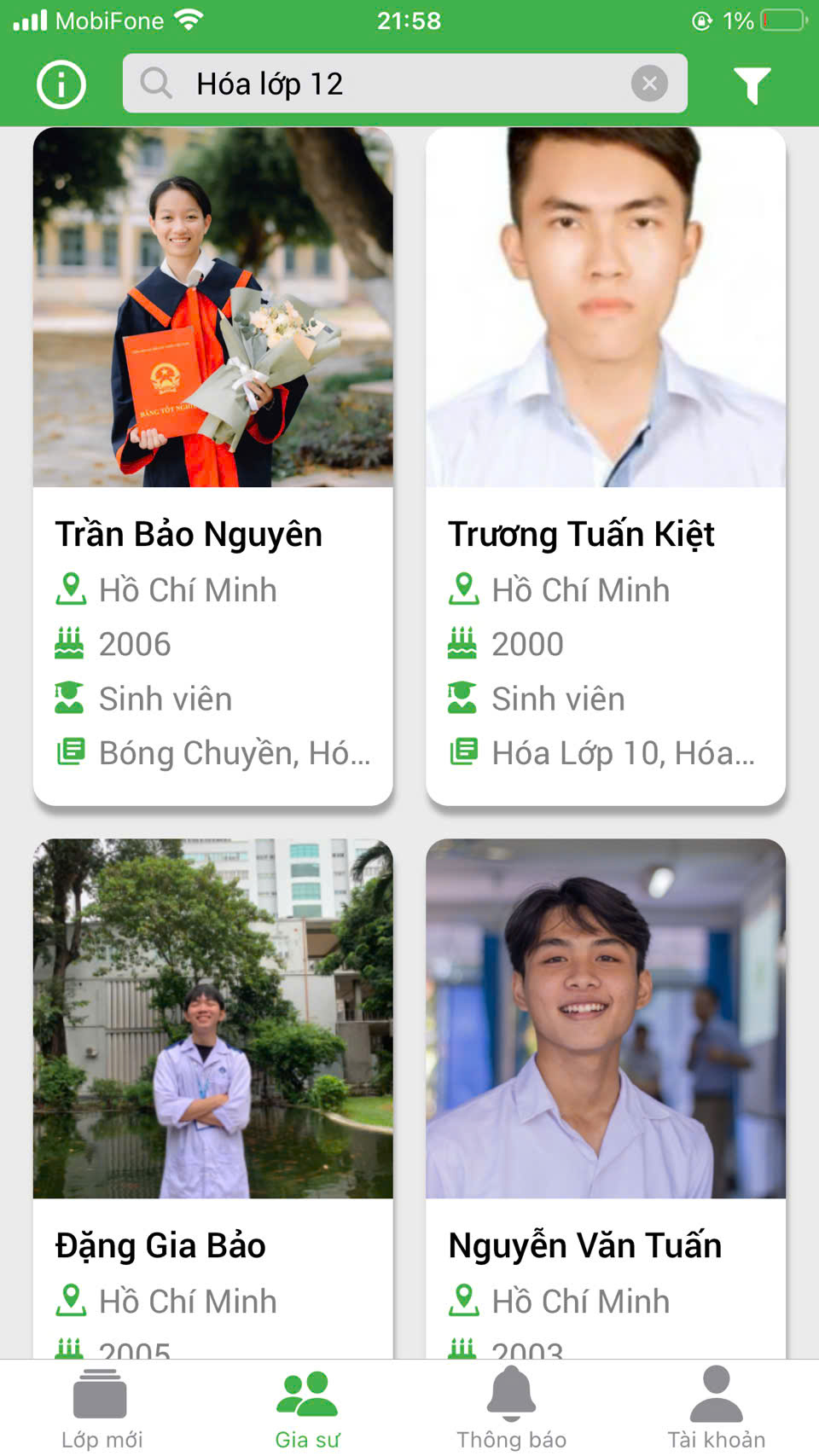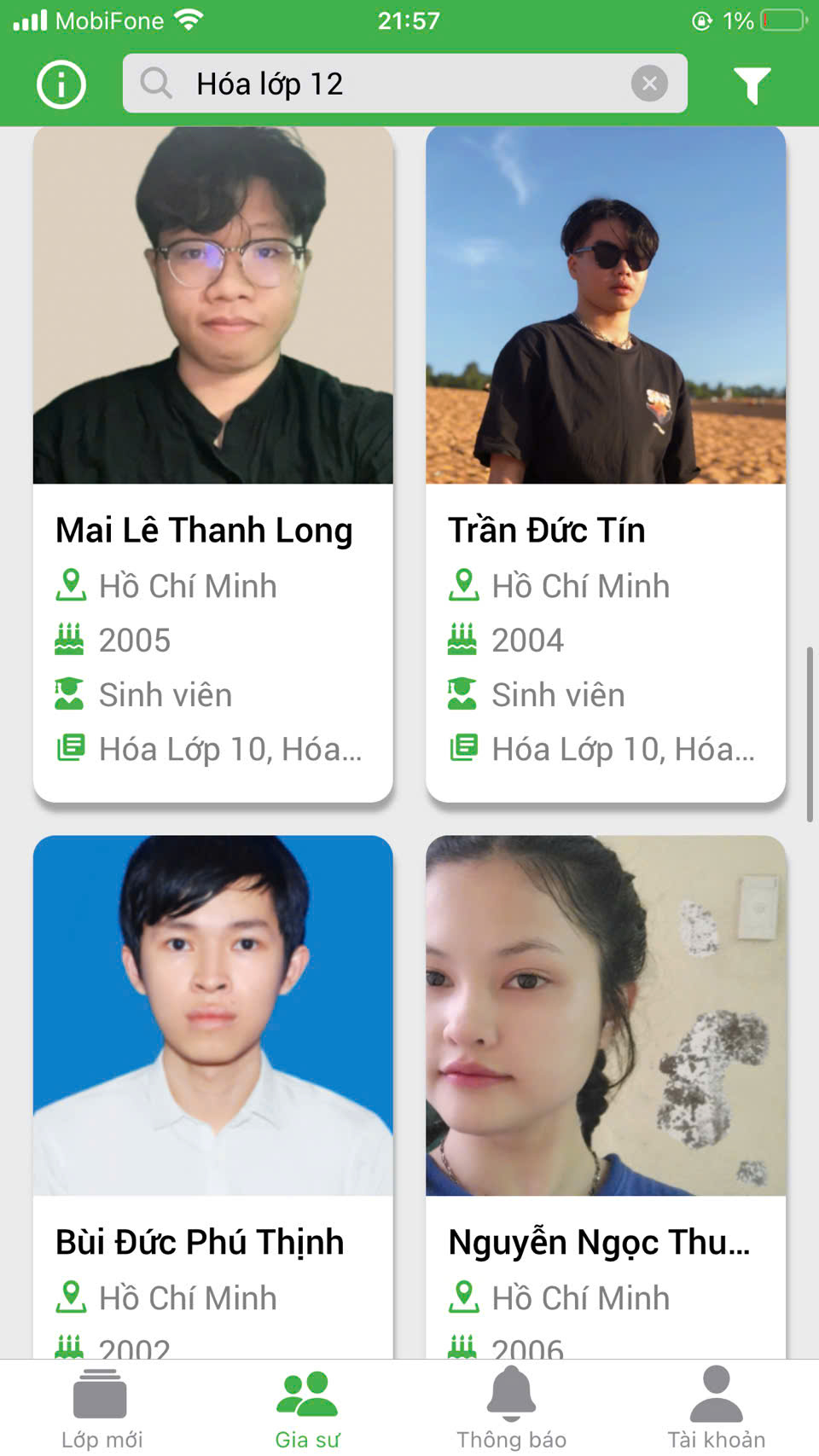 Bước 2: Tìm kiếm gia sư MÔN HÓA LỚP 12.