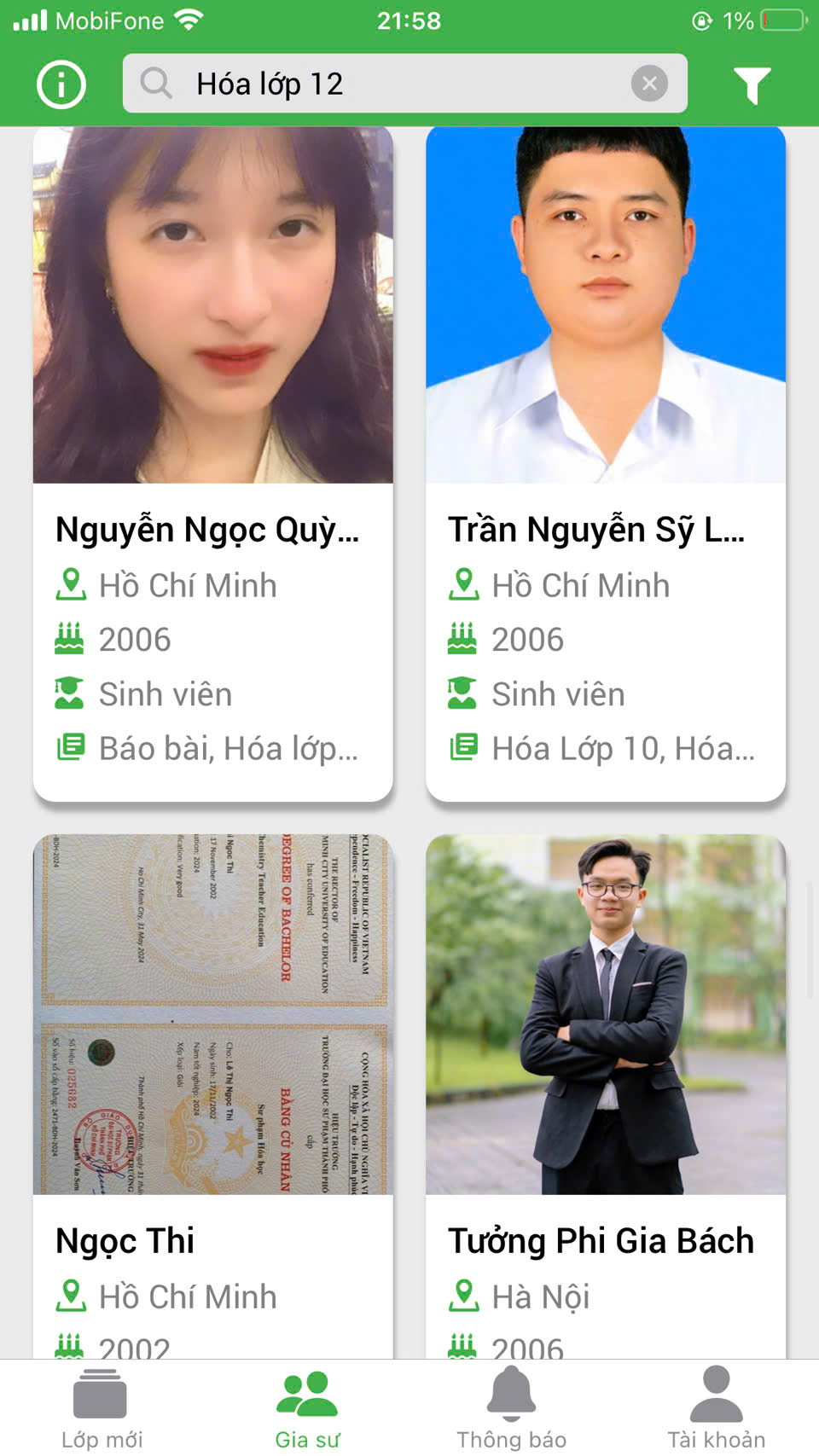 Phụ huynh học viên xem hồ sơ gia sư dạy kèm môn HÓA LỚP 12.