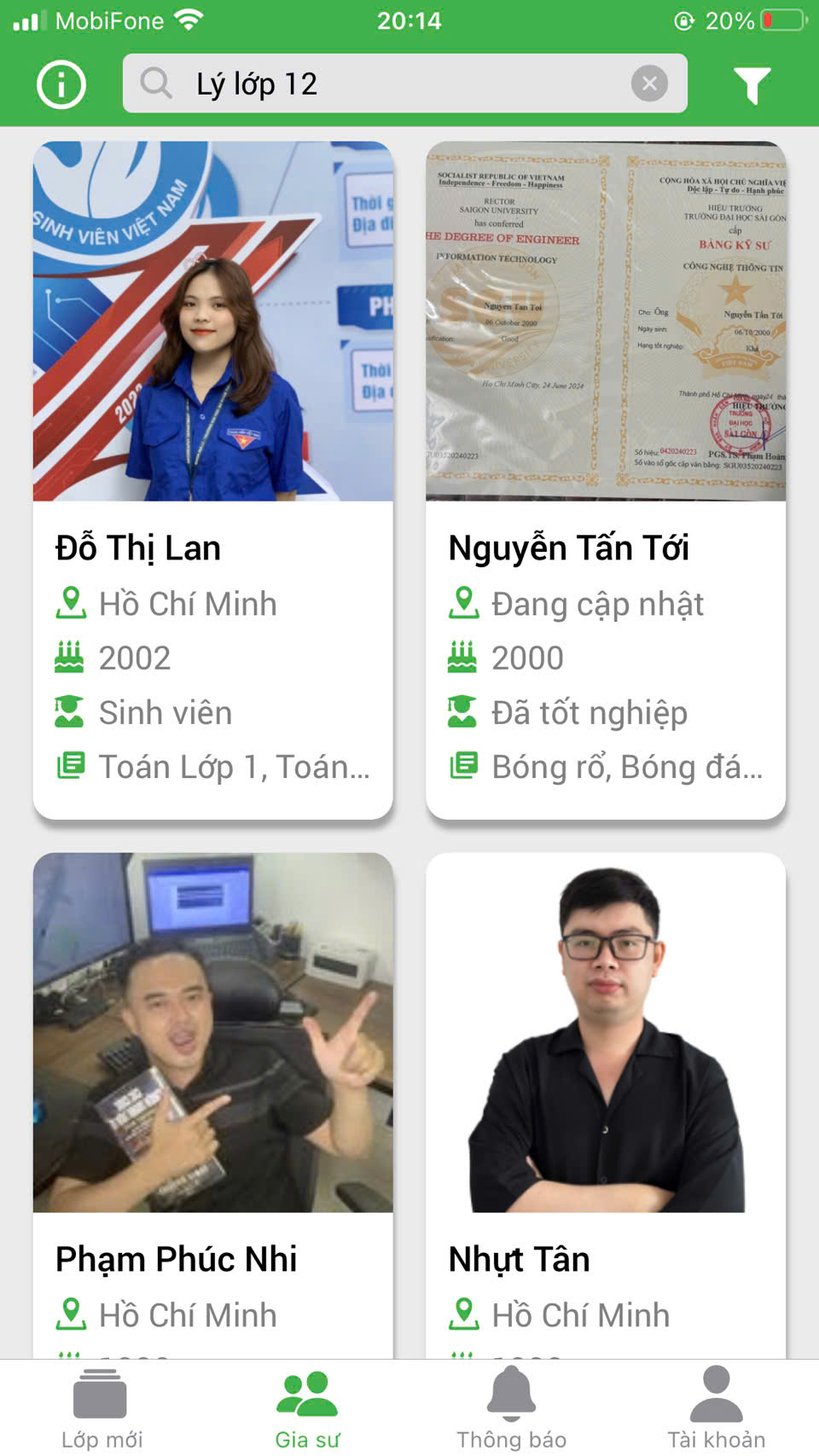 Bước 2: Tìm kiếm gia sư MÔN LÝ LỚP 12.