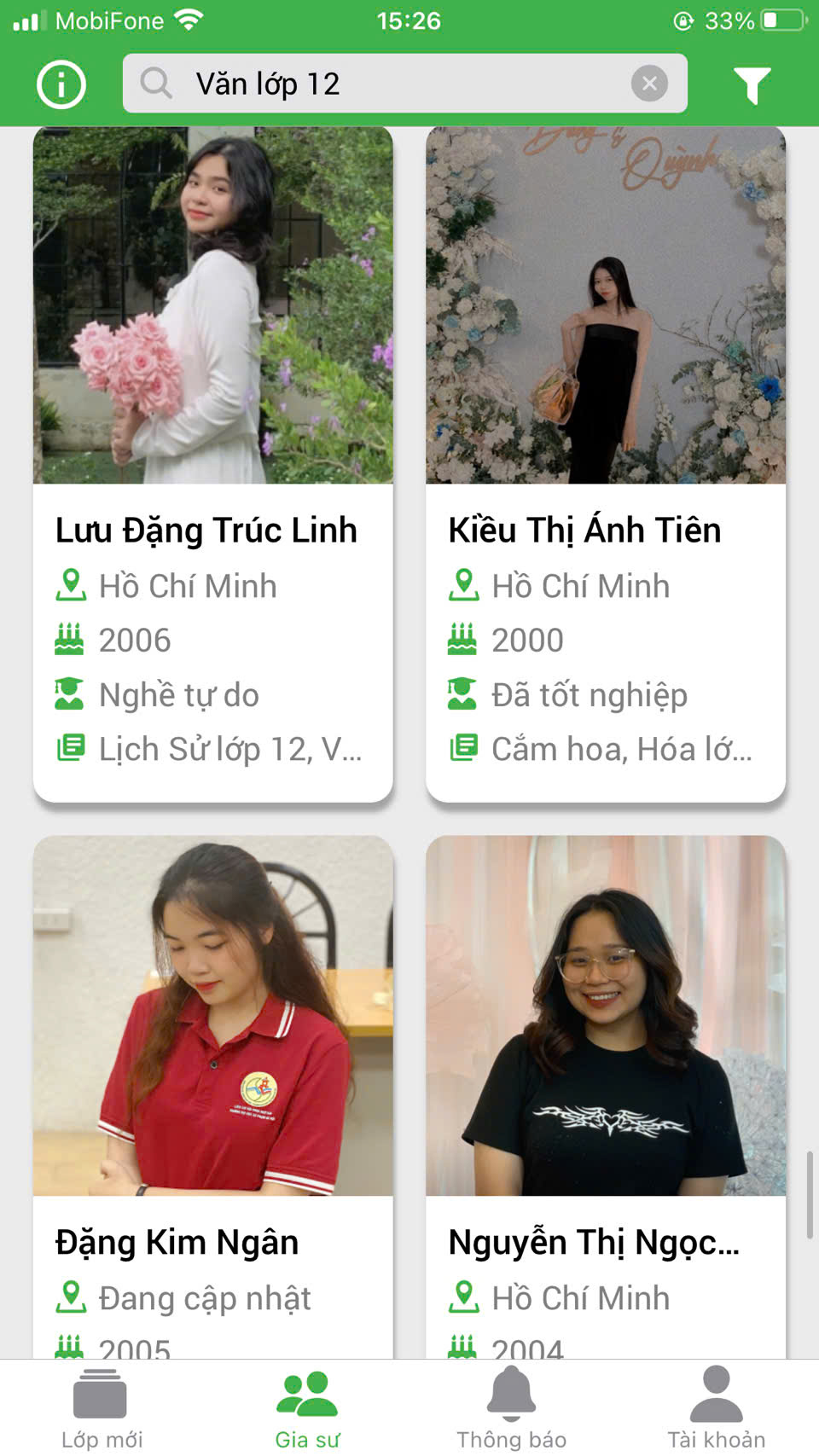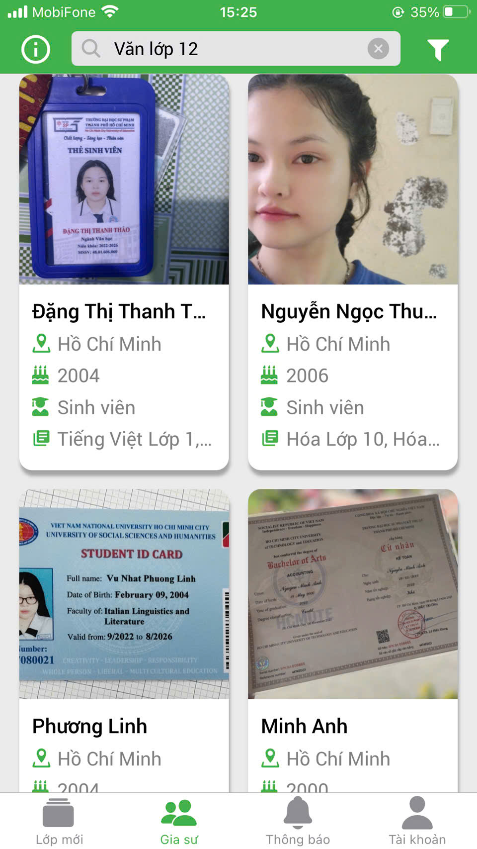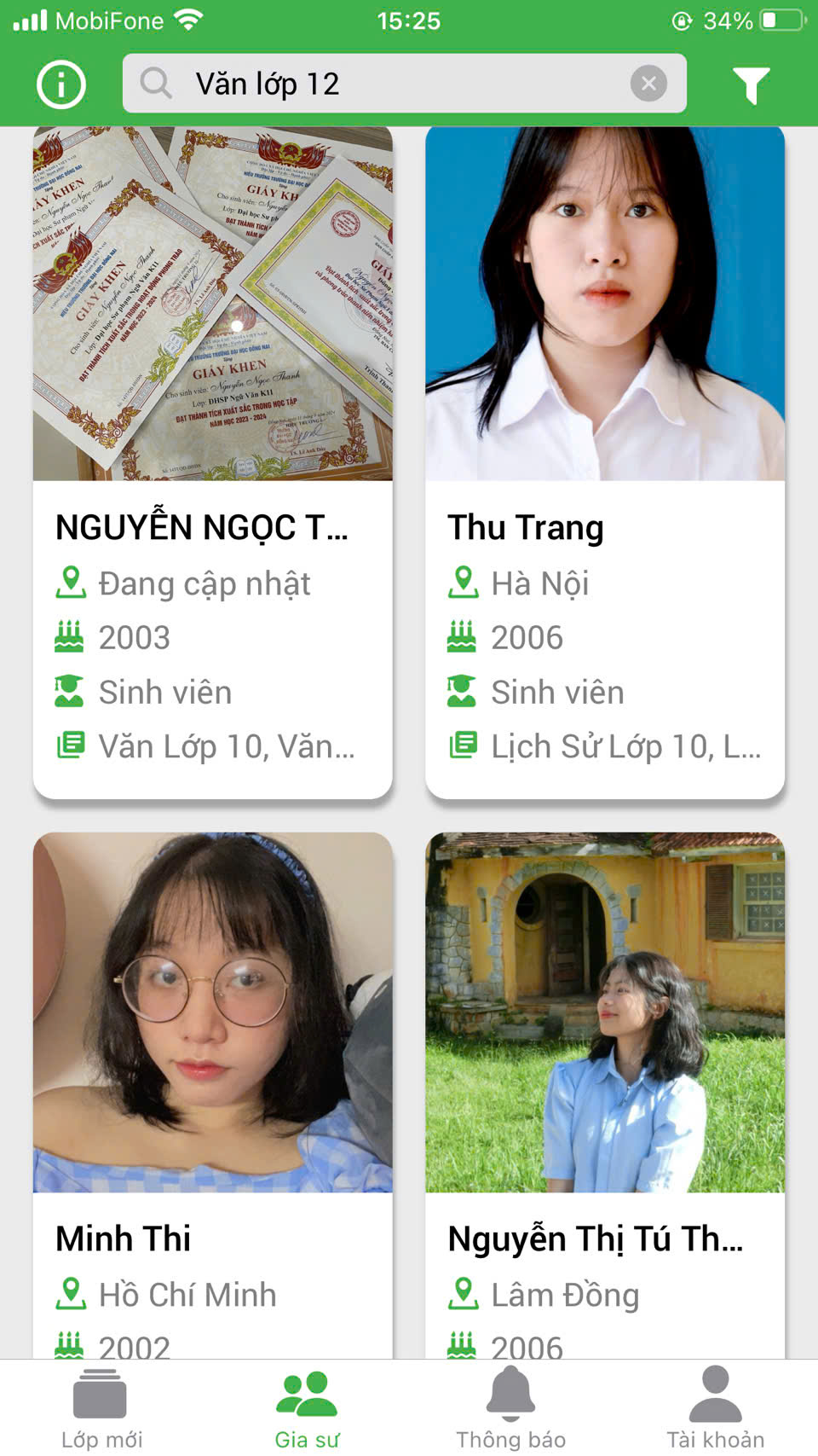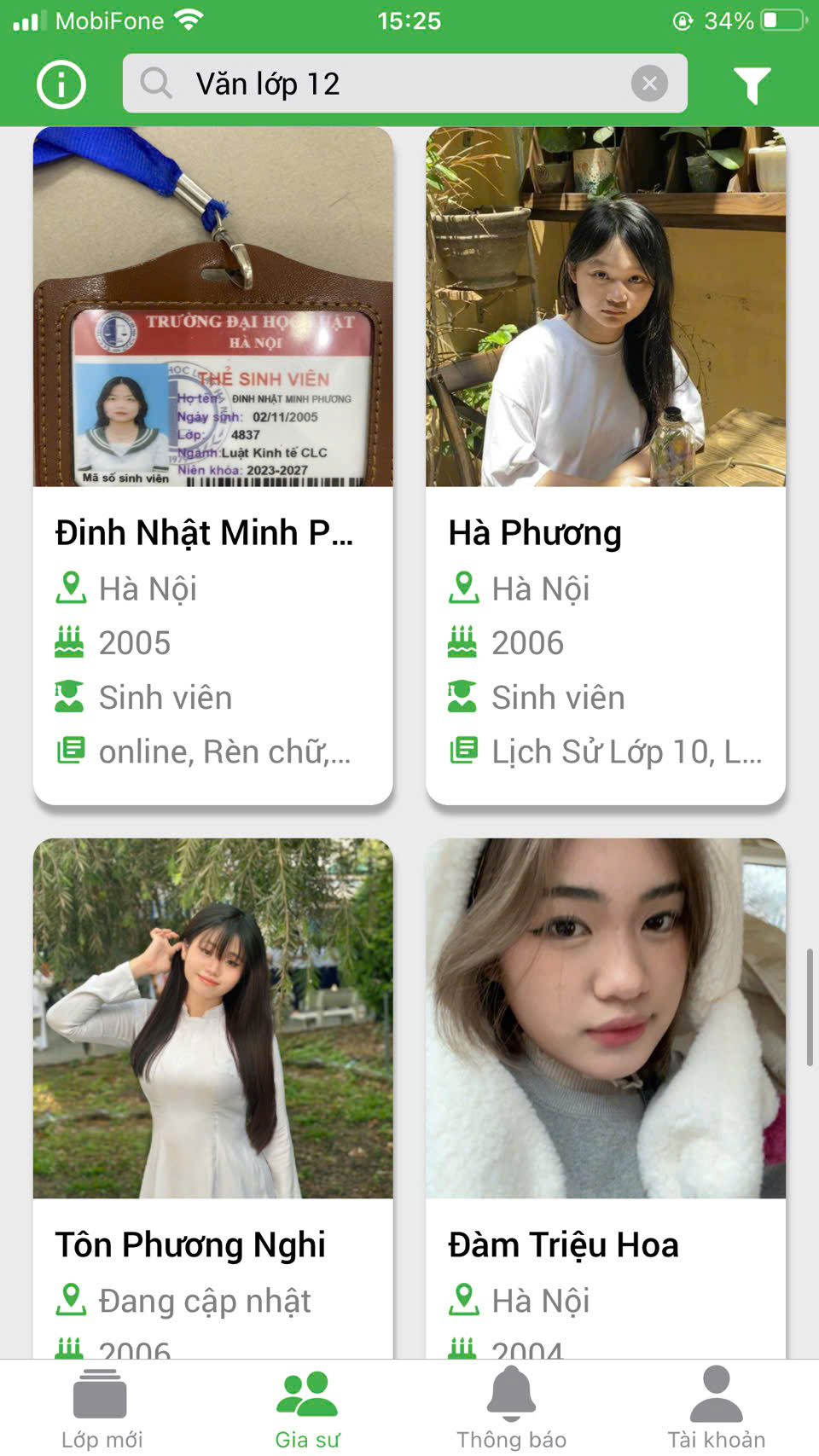 Phụ huynh học viên vào website Daykemtainha.vn, menu gia sư, môn học phụ huynh chọn ví dụ ‘ văn lớp 10’ sẽ ra danh sách gia sư dạy kèm môn văn lớp 10 để phụ huynh tham khảo
